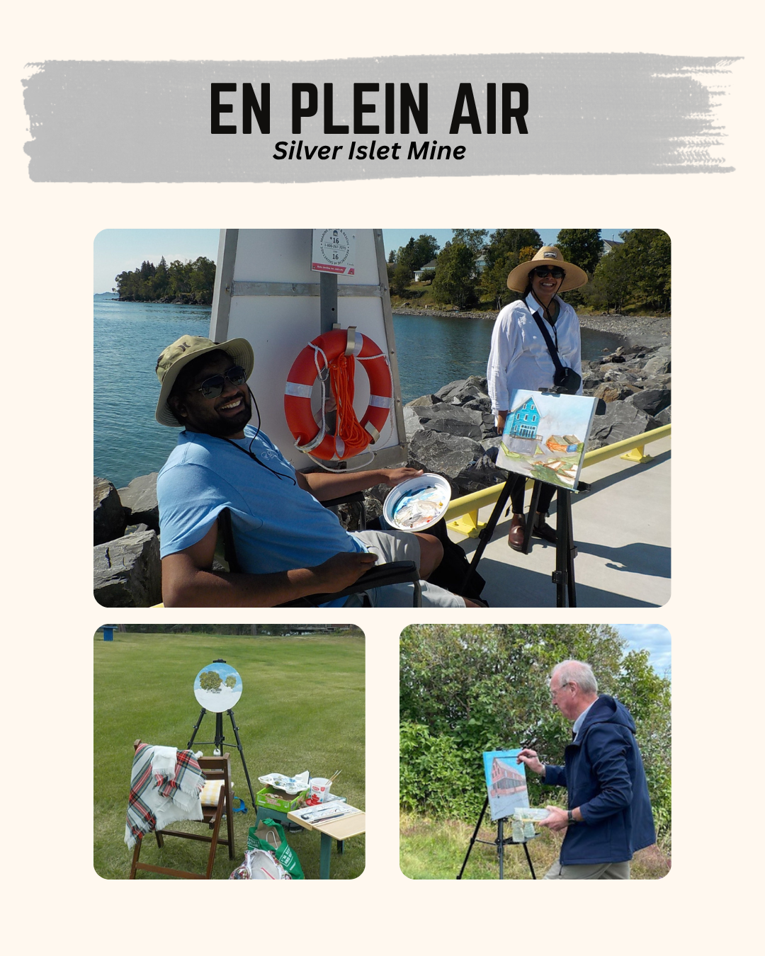 Organized by local artist Irene Warmenhoven, a group of artists gathered to participate in a second iteration of Irene’s “En Plein Air” painting workshop, this time in the former mining community of Silver Islet. Featured in this display are the works of 14 artists who attended the workshop.